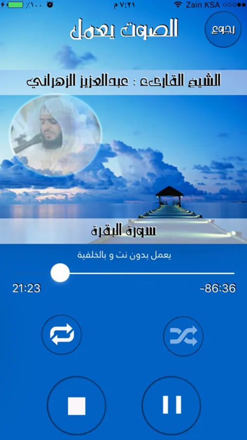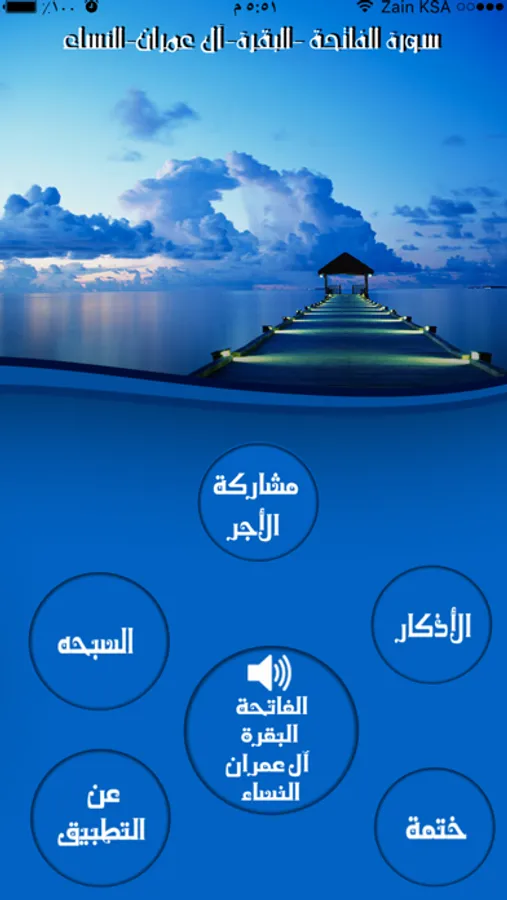 يحتوي هذا التطبيق على سورة الفاتحة و البقرة و آل عمران و النساء المسموعه و دعاء القنوت للشيخ القارىء عبدالعزيز الزهراني ويعمل بدون نت وبالخلفية و عداد للتسبيح واذكار الصباح والمساء و الصلاة والسفر.