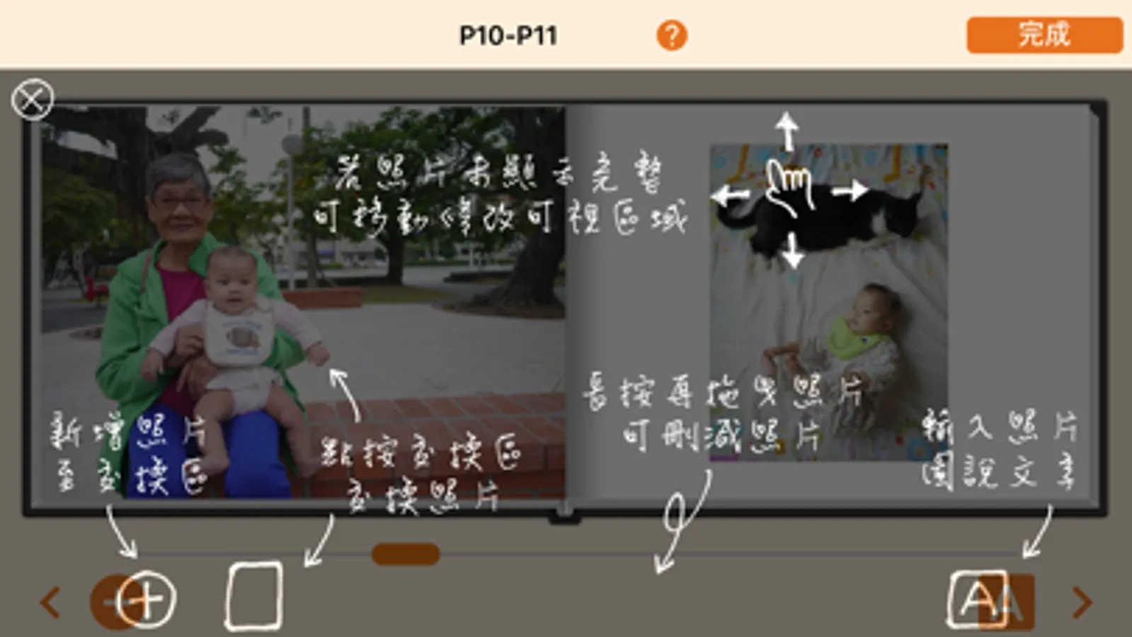 依照自己需求匯入製作照片數量,智慧排版系統將自動選擇版型,調整照片大小,完成排版!若有特需需求,亦可進入編輯模式,依照個人需求排版,並且可加上説明文字。