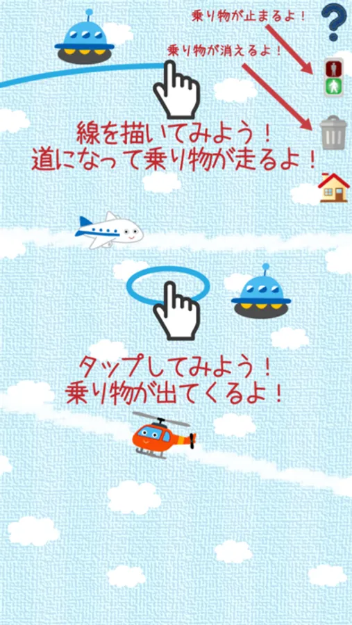 ・スワイプすると道(線路や道路など)ができて、乗り物が走ります。