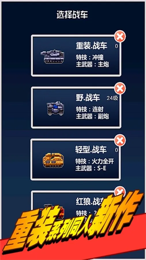 怀旧任天堂超级机器人大战模式的放置类单机游戏。游戏有着和小霸王时代的重装机兵有着相似的故事背景和世界观,整个过过程中玩家无需投入过多时间,只需选战车去挑战赏金任务的BOSS即可,躺着也能玩睡着了也能挂机升级。战车所能习得兵器也会越来越多。为了顺利地展开在迷宫的冒险旅程,玩家需要尽可能提高战车的能力。