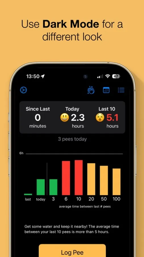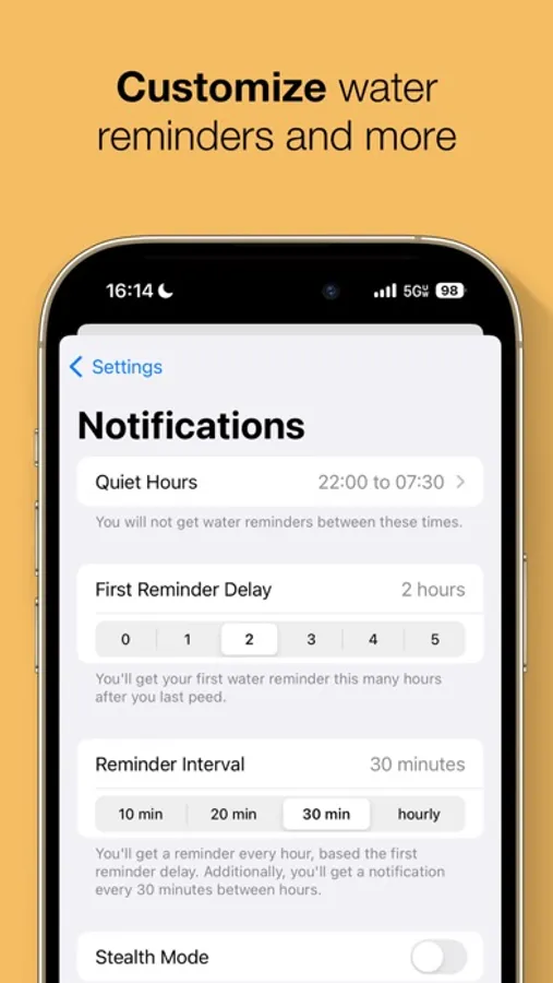 Customize when you receive water reminders, anywhere from 0–5 hours after you last peed. You can also adjust the interval between notifications from the 30-minute default.