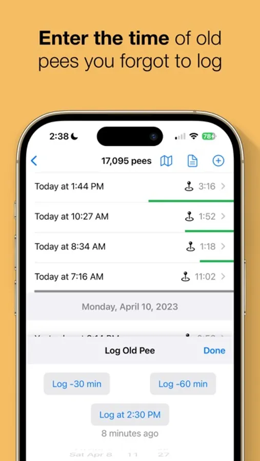 • Slide your finger across the Log Pee button in the app to log a pee at a specific time in the past hour