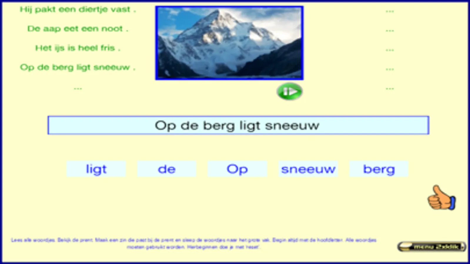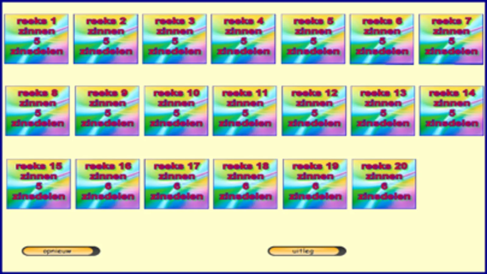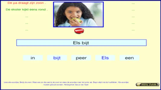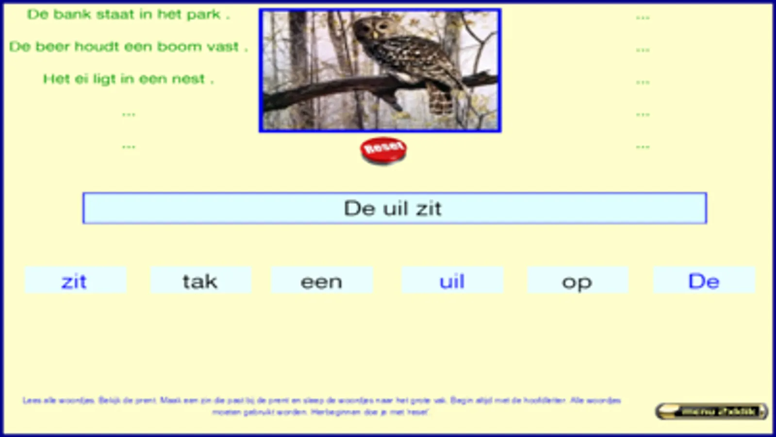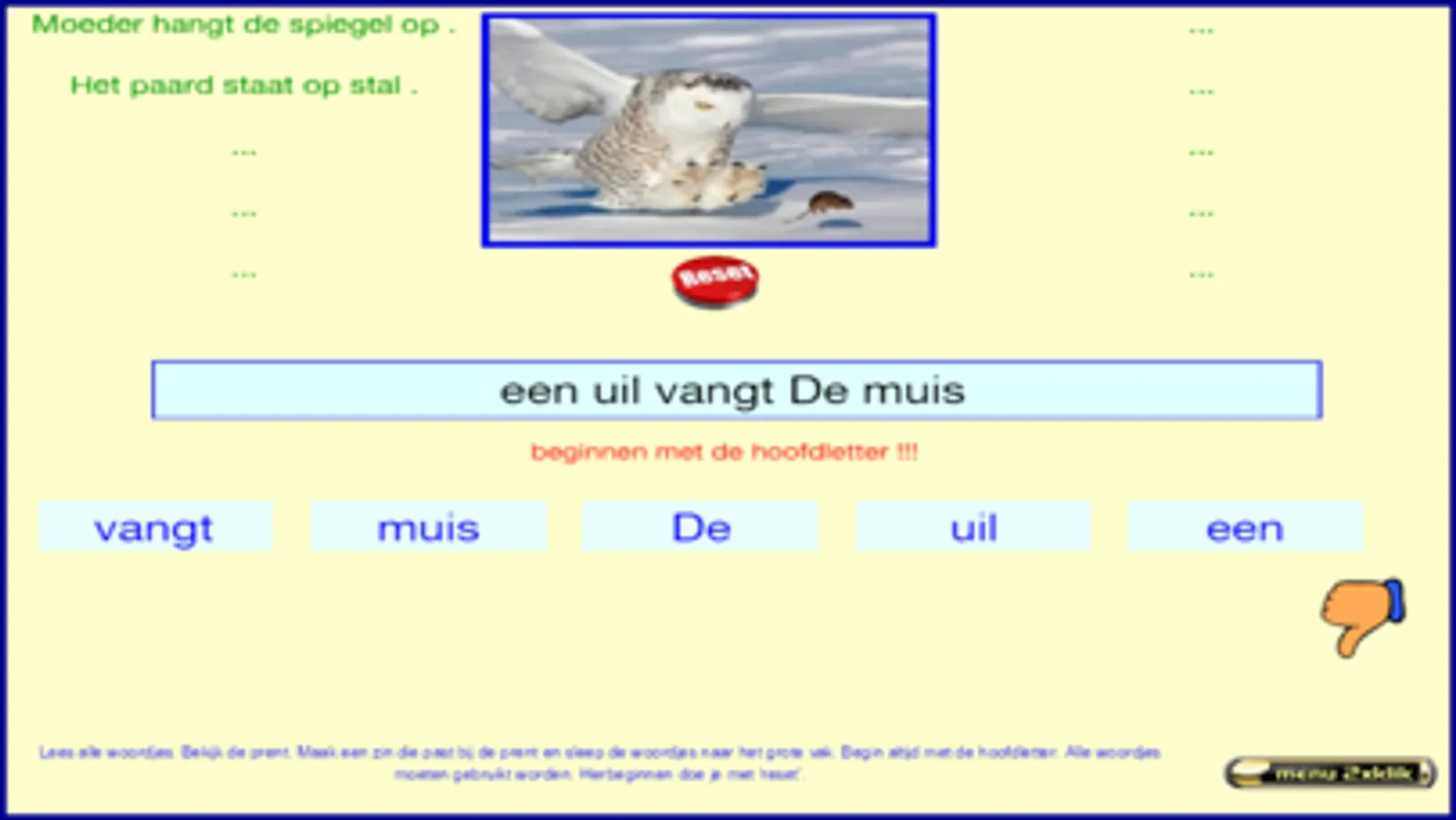 Met losse zinsdelen een zin kunnen vormen. Er zijn 15 reeksen met elk 10 zinnen en 5 zinsdelen en 5 reeksen met 6 zinsdelen (200 zinnen). Drag- en dropoefeningen. Deze reeks oefeningen volgen de leesmethode Veilig Leren Lezen van uitgeverij Zwijsen (een veelgebruikte leesmethode in België en Nederland). Ik heb deze oefeningen gemaakt steunend op mijn 25 jaar ervaring als leerkracht 1ste leerjaar. Alle oefeningen worden visueel ondersteund. De oefeningen kunnen best gemaakt worden vanaf AVI-niveau 2. Billiau Danny.