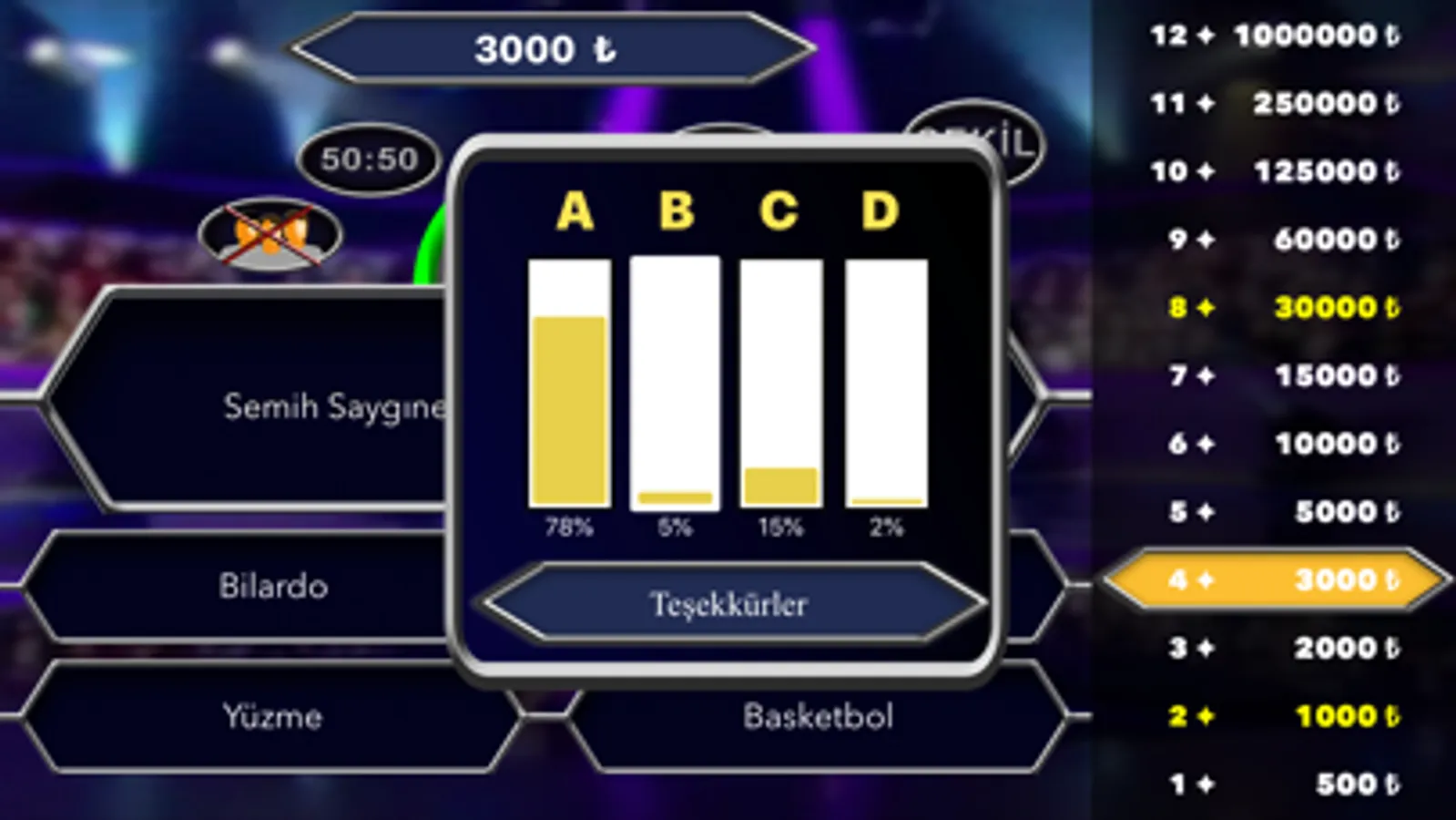 Kim milyoner olmak ister tarzı yarışmalar arasında en iyilerden. Milyoner bilgi yarışması ile bilginizi kolayca test edebilirsiniz. Uzman kadro tarafından hazırlanmış binlerce soru ile elinizden düşüremeyeceğiniz bu oyun şimdi ücretsiz.
