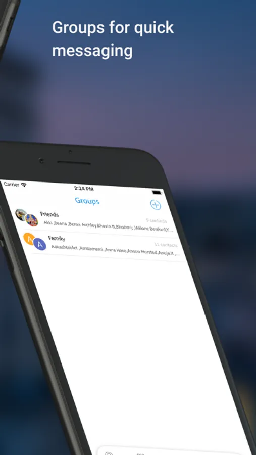 * Groups: Add unlimited contacts to unlimited groups, example Work, Family and Friends. Use groups to send message and e-mail to all of them with a single click.