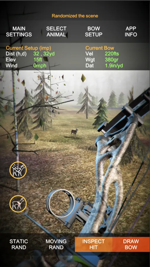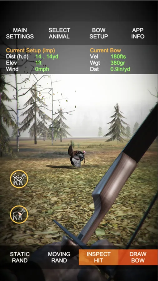 The app simulates arrow flight in realtime 3d and provides useful target hit information based on target distance, direction, elevation of hunter and wind.