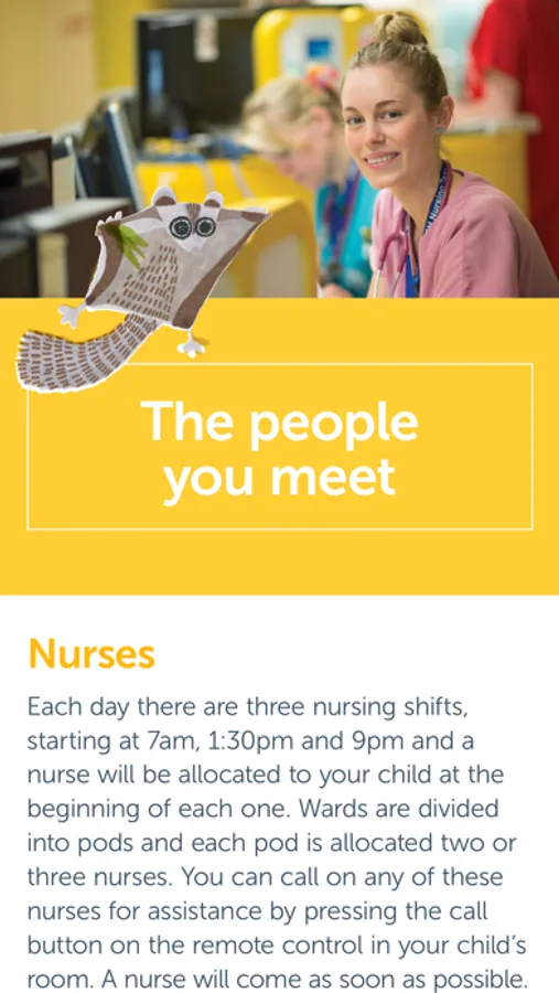 Ward specific guides – including features of each hospital room, what to expect on your ward, helpful information about the people you meet, where to find things you need, meal times, visiting hours and things to do.
