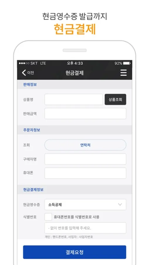 - 현금결제 고객의 경우, 현금영수증 발행 가능.
