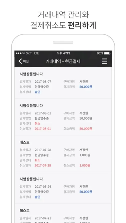 - 고객의 카드정보를 받아 어플리케이션에서 입력 후, 결제 승인.