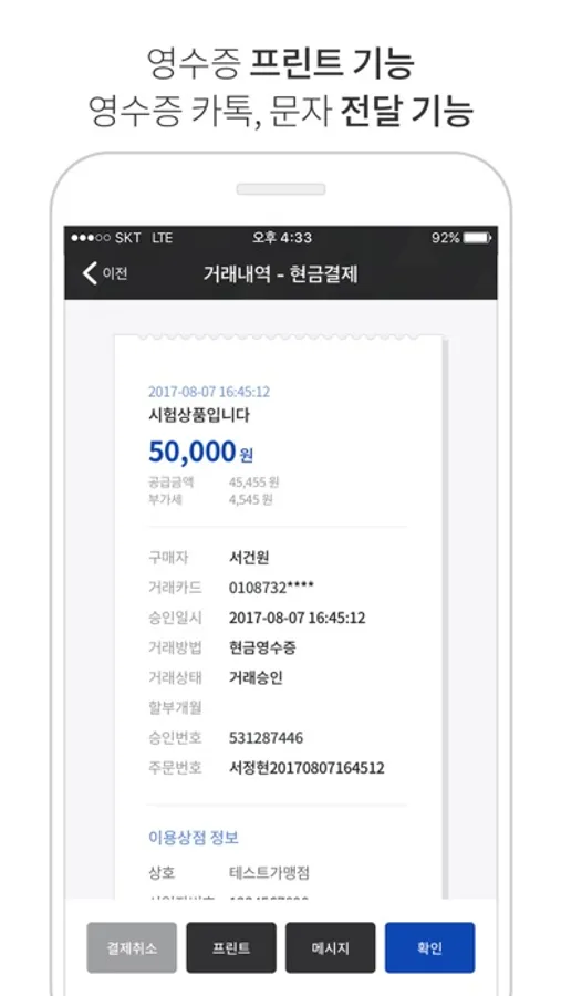 - 비대면 결제의 경우, 스마트 폰에서 제공하는 SNS메신저로도 매출전표 공유 가능.