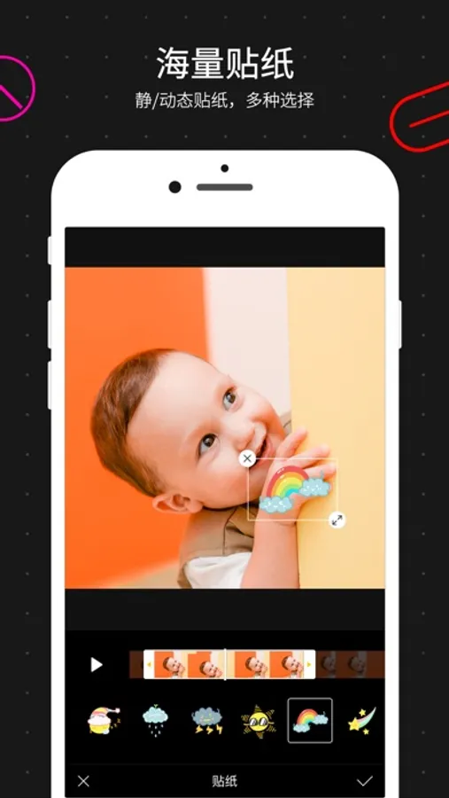 丰富的贴纸类型:萌宠、搞怪、场景、轻装应有尽有,完美贴合、精准跟随不是不可以。