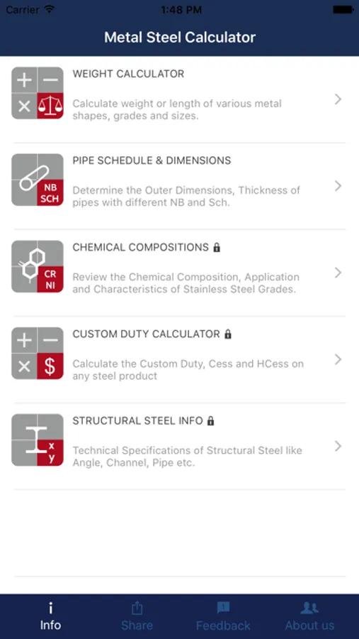 Metal Steel Calculator is a one stop app for all engineers, steel traders, fabricators, procurement officer, Proposal engineers to calculate steel weight, study chemical composition of different grades, evaluate custom duty of steel product, read the entire Strutural steel chart with diagrams. The application is uniquely designed to reduce manual calculations.