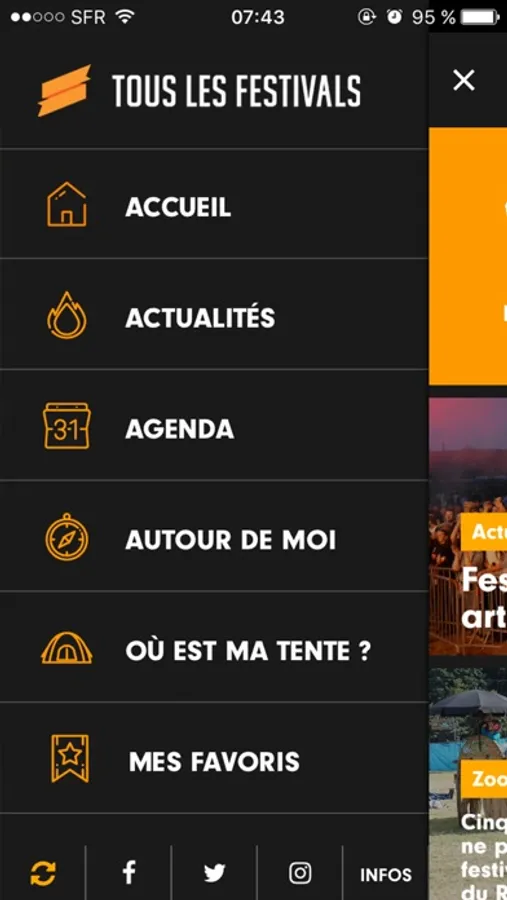 Découvrez les dernières news et reportages grâce à la partie actualité. Recherchez les festivals les plus proches de chez vous avec « autour de moi » et préparez votre agenda en sélectionnant vos événements favoris. Avec « ou est ma tente » fini les heures à chercher votre tente parmi les milliers d’autres identiques. Localisez votre emplacement et laissez-vous guider à votre retour sur le camping !