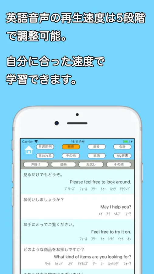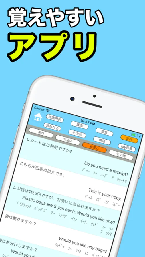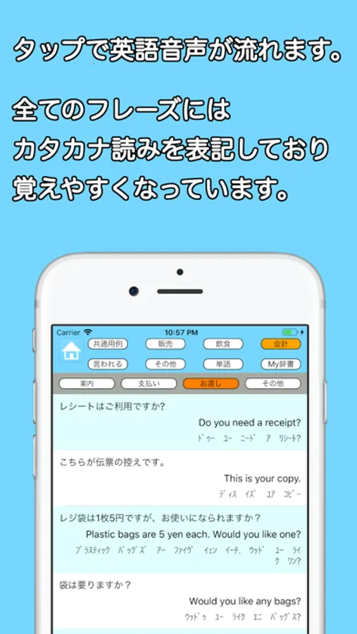 - タップで英語フレーズの音声が再生され、カタカナ読みも表示されて覚えやすい。