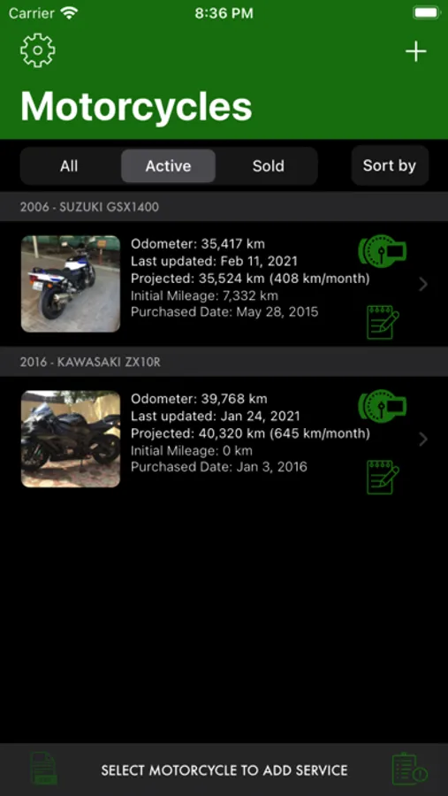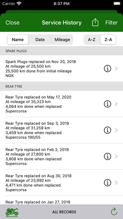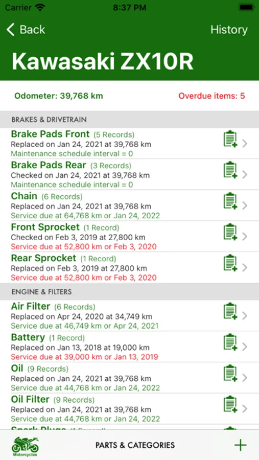 Multiple motorcycles can be added and tracked. When a motorcycle is added a default list of parts is generated, these parts can be deleted and custom parts can also be added if required.