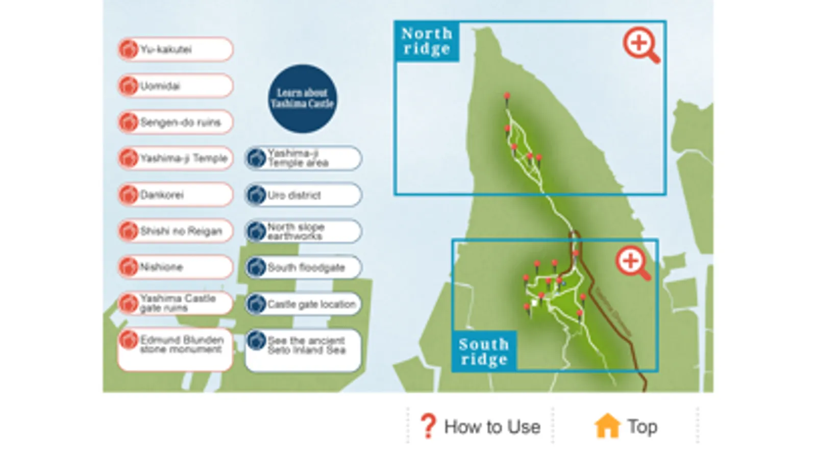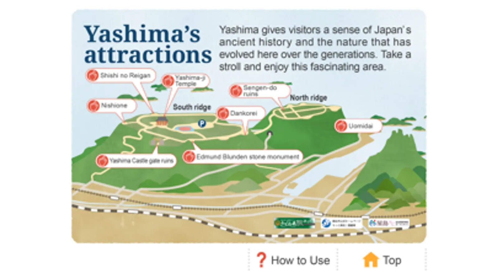 Pop-up explanations with photos introduce nine famous attractions of Yashima.