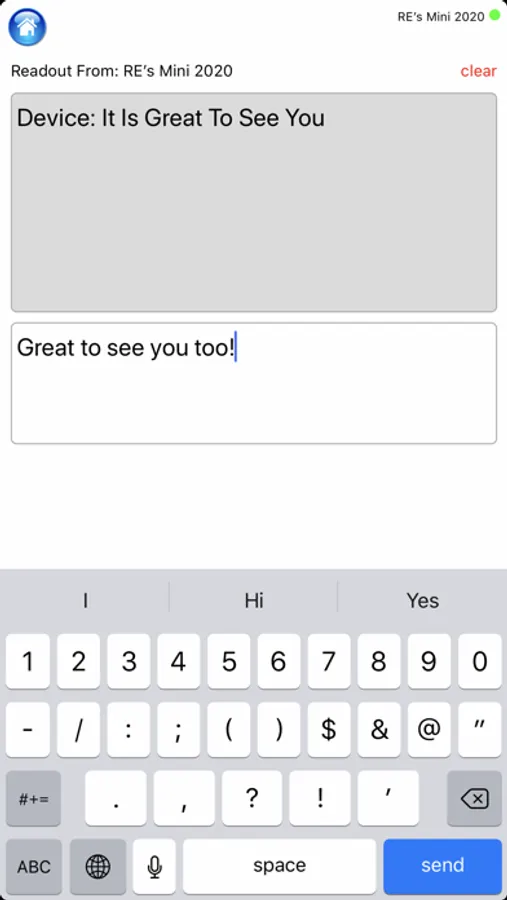 Sends whatever is put into the Talk Suite message window , word by word, onto a nearby iPhone screen that has a simple Bluetooth connection. Even send messages to a whole group of friends and they can all send back to you! The perfect answer to communicating in noisy environments - like restaurants or sports games - when you just can't hear an iPad.