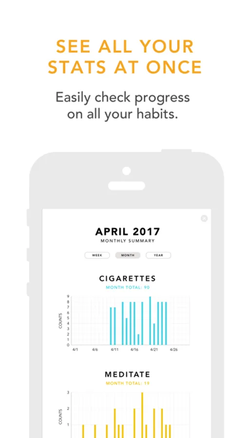 Each tracker is fully customizable. Set your tracker to reset every day, week, month, year or never. Use TALLY's charts, calendars, and notes to analyze activity and detect any progress or patterns. The main screen will display all of your trackers. You can use a filter to display your trackers in a way that makes sense to you.