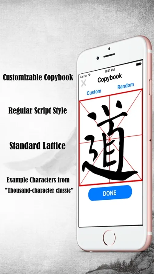 *The style of calligraphy available in the copybook is regular script (楷书). Users can choose their favorite character or randomly select from "Thousand-character classic" (千字文).