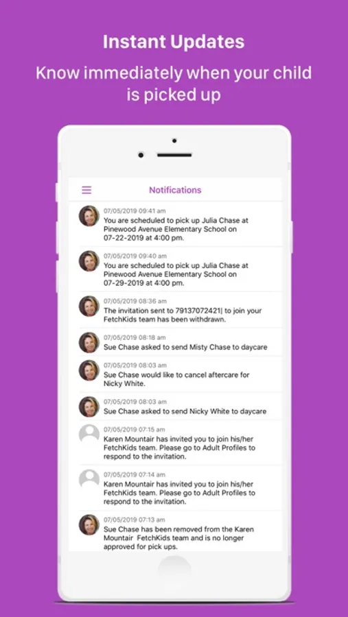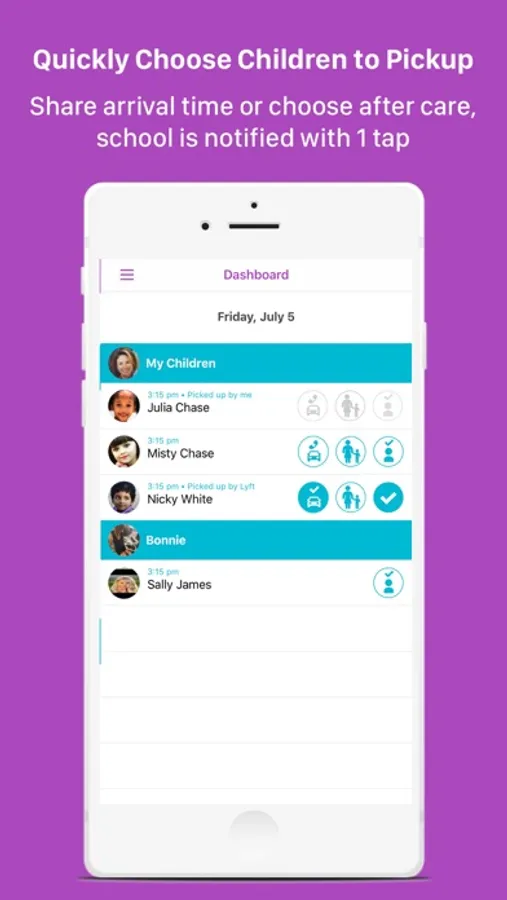 Make pickups smoother for parents, kids, and school administrators. Set pick up times for your children, alert school of your arrival time, set up carpools, get notified when your child is picked up, and more! FetchKids is a win-win for everyone involved in coordinating student pick-ups at the end of the day.