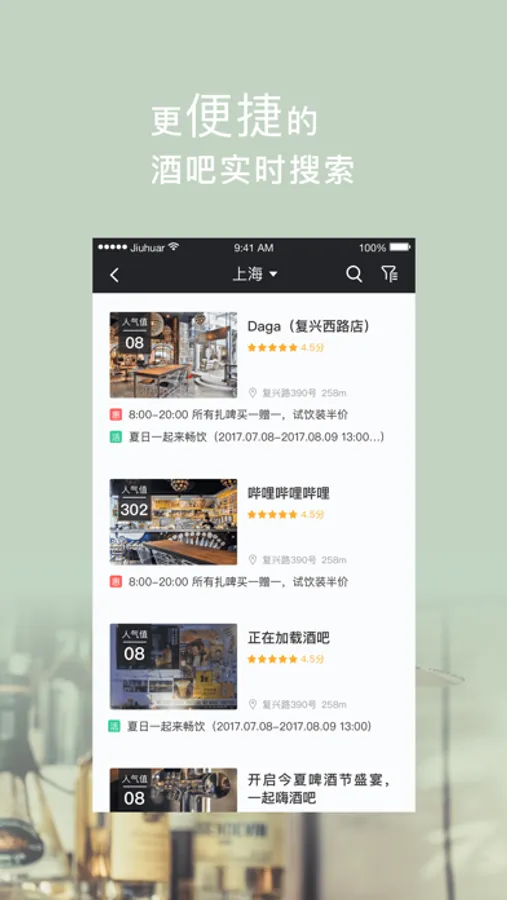 3.酒吧地图:找啤酒、精酿啤酒酒吧的实力派,周围有哪些精酿啤酒酒吧、啤酒超市、餐吧?哪些精酿啤酒吧、啤酒超市、餐吧的服务好?哪些环境优?哪些节目多?哪些精酿啤酒全?哪些福利棒?酒花儿提供全国的酒吧导航以及众多网友的真实点评,助你成为各地的酒吧达人;