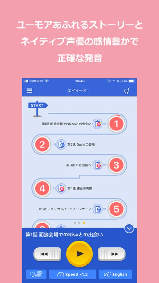 英会話音声に合わせてテキスト(セリフ)が流れます(「テキストシンク」機能)。表示・音声ともに英語・日本語が選択できます。はじめはセリフを見ながらでもOK。バックグラウンド再生に対応しているので、iPhoneをポケットの中に入れたままでも繰り返し聴くことができます。ひたすら繰り返し聴きましょう。まずは1日1エピソードを10回を目標に。