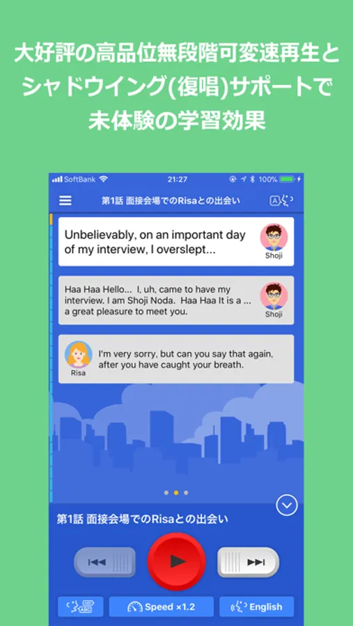 スロー音声とスピードシャドウイングの組合せでこれまでにない英会話学習体験を。