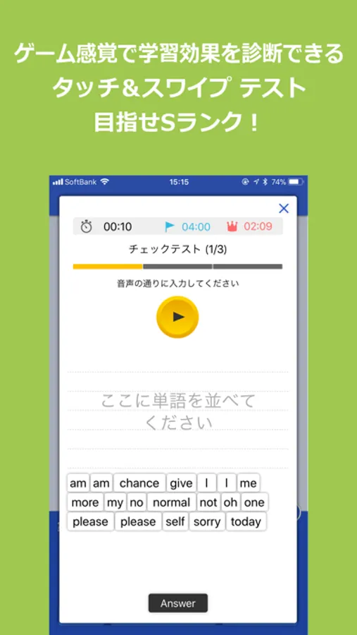 エピソードを覚えるほど聴き込んだら、その成果をゲーム感覚で確認できる「タッチ&スワイプ」テストに挑戦しましょう。目指せSランク!