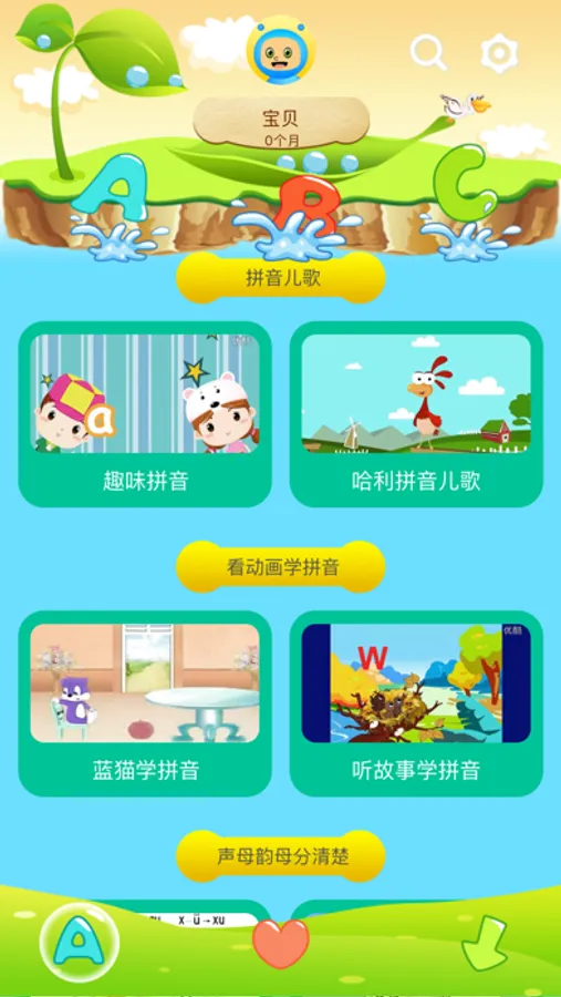 宝宝快乐学拼音,提供了从幼儿园到小学一年级必学的拼音和几百个汉字内容教学视频,包括真人课程、拼音儿歌、拼音动画片