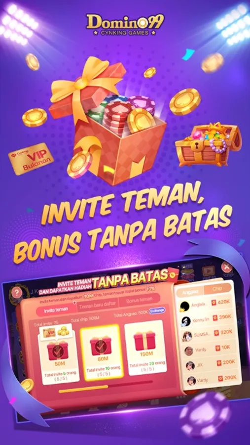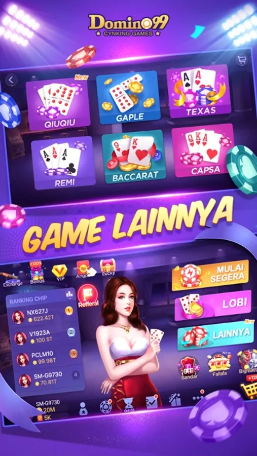 1.Chip Gratis Non-stop!Setelah daftar langsung dapat Tas Hadiah Pemula;Tiap harilogin dapat ambil Chip Login; Selesaikan Tugas dapat ambil Chip; Kotak Harta diRoom, Undang teman, dan ikut Kegiatan, Bonus Fans dapat Chip Gratis Non-stop!