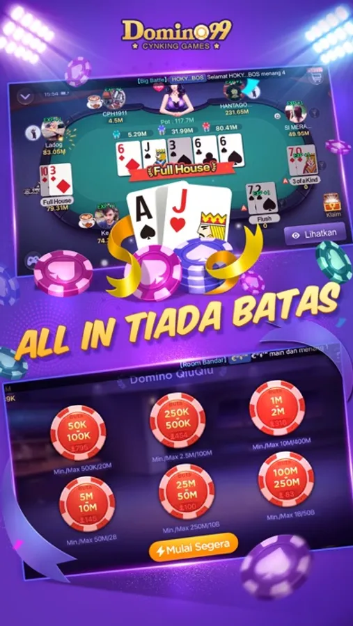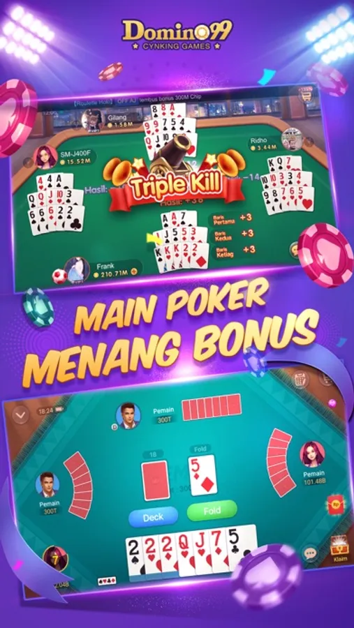 3.Mahir teknik kartu mesti dipamerkan!Apakah Anda merasa kurang menantang? Apakah Anda merasalawan terlalu lemah? Ayo segera main di Room Lanjut, bertanding melawan paraMaster secara jantan!Jika Anda dapat kartu jelek namun dengan kemahiran Andamemenangkan pot, Ayo segera sharing , Pamerkan teknik kartu Anda!