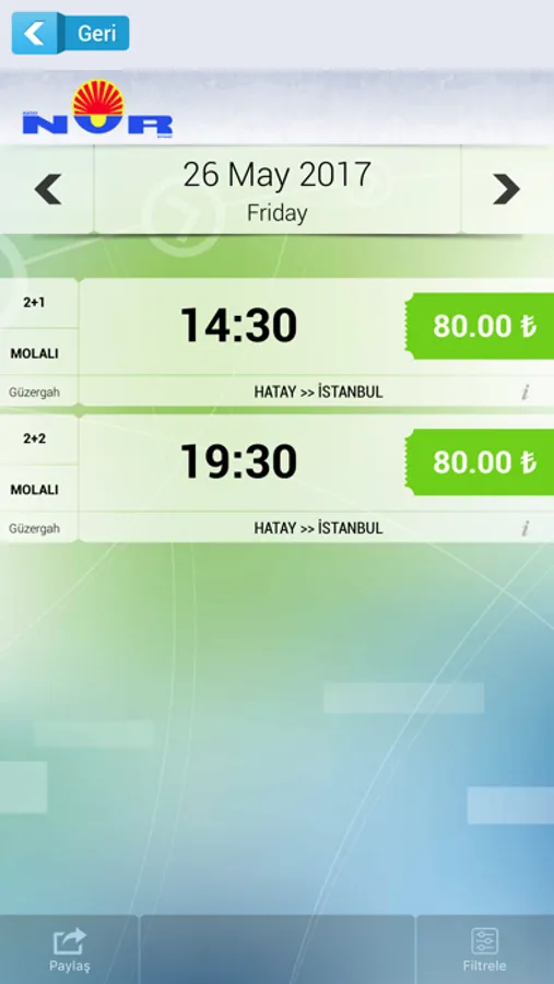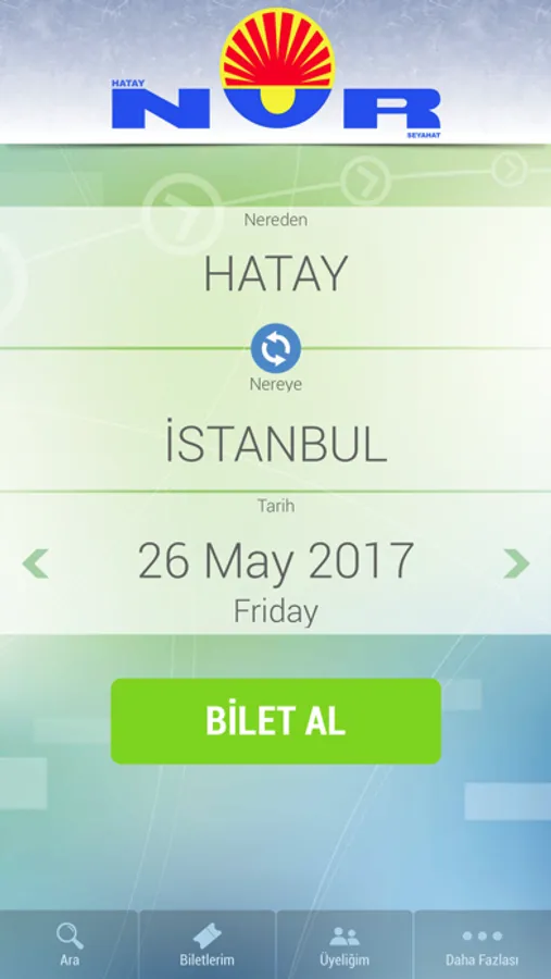 Hatay Nur Seyahat'in şehirlerarası ulaşım biletlerinin satılmasını sağlayan bir iPhone uygulamasıdır.