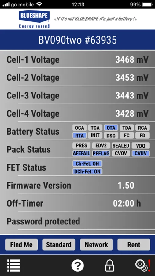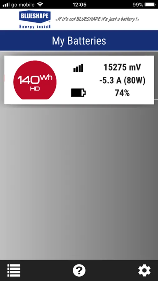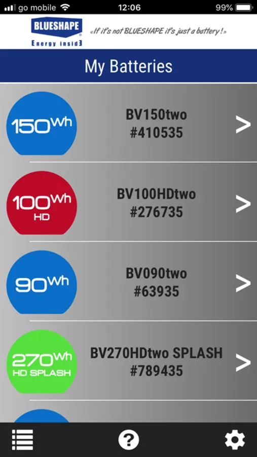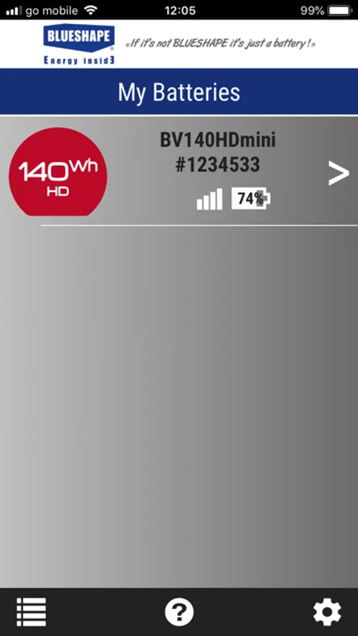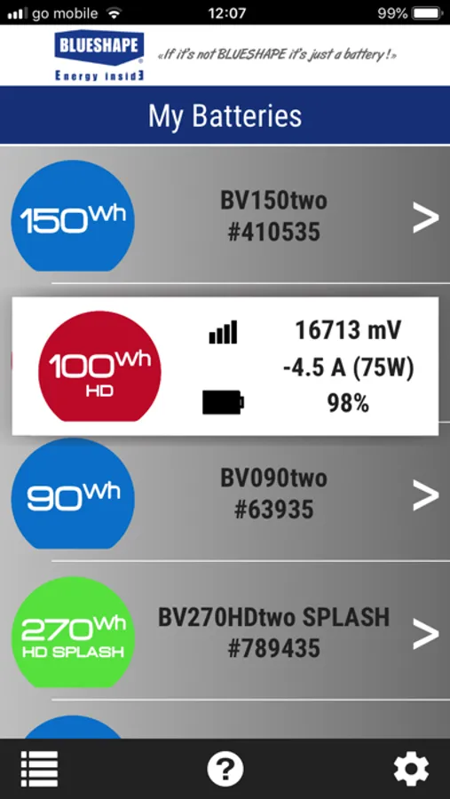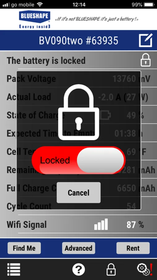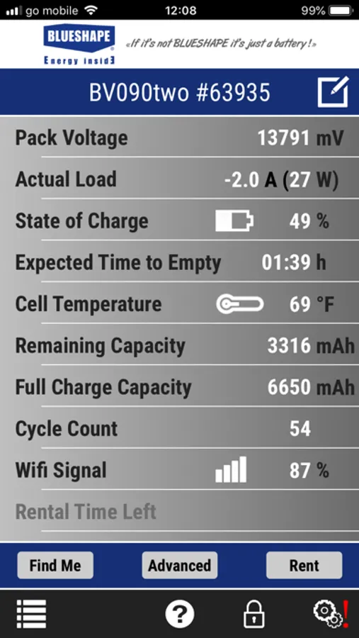 This App has been devised to enable users to have remote control at their fingertips on the field, in any studio environment , TV or cinematic production. They will be able to visualise on a single screen in real time, data being transmitted from one or several Blueshape batteries. Through this App, users can read or monitor several performance and status parameters for each of the batteries and furthermore, rental houses can actually manage their fleets by controlling, extending or restricting, the leasing of their batteries using uniquely generated codes provided by BLUESHAPE web-based platform to its authorised subscribers.