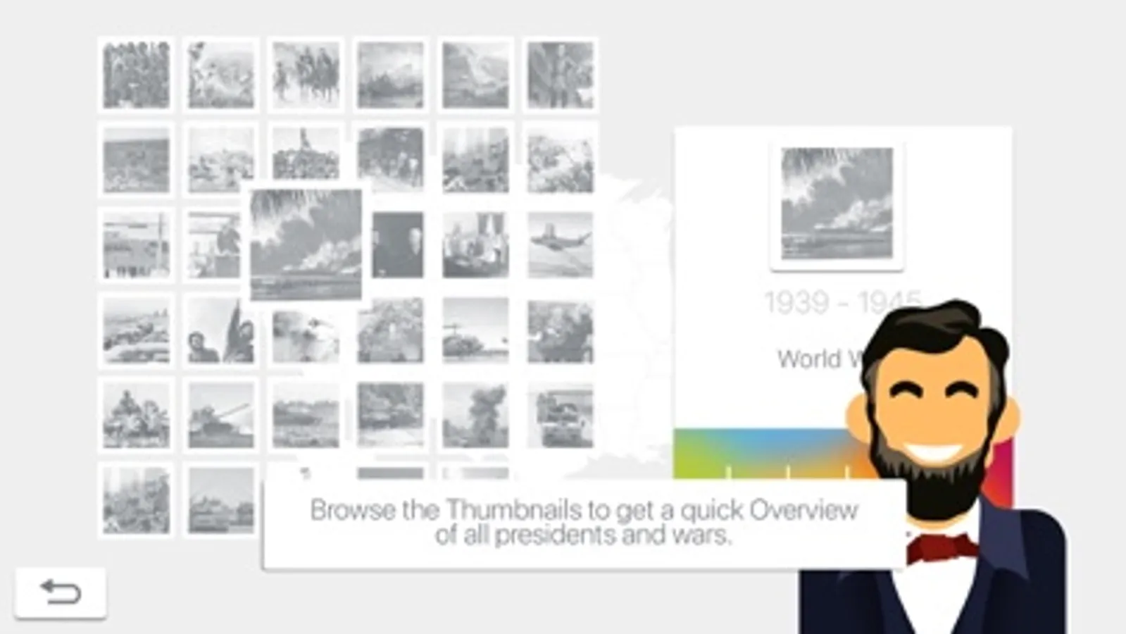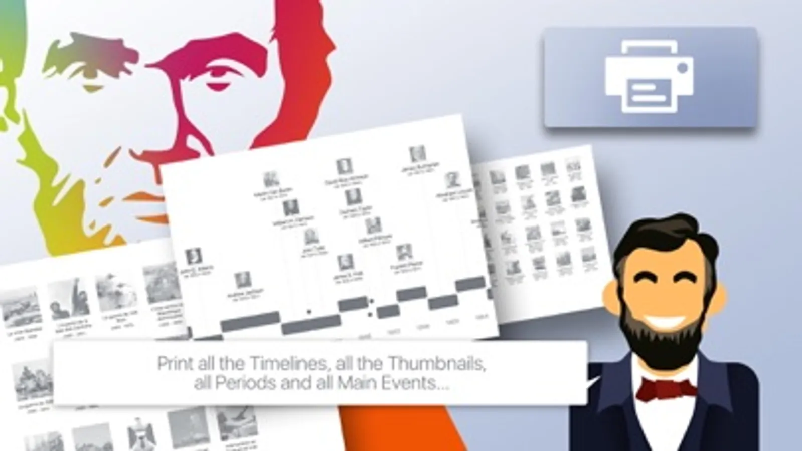 The learning mode allows you to practice all topics. In this mode, you'll see presidents, wars, key events and periods in interactive timelines. You'll explore the thumbnails of the presidents and wars on a single screen, to get the whole picture. Finally, you can print the timelines, thumbnails and a list of the main events and periods.