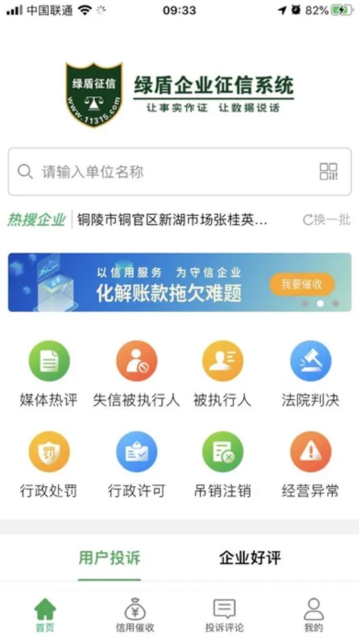 绿盾征信(www.11315.com)是“绿盾全国企业征信系统”的简称,提供市场主体的信用查询、信用记录、信用报告、信用档案、信用评价等服务,旨在帮助企业见证信用,保障大众消费安全,服务政府监管市场,促进社会和谐发展。