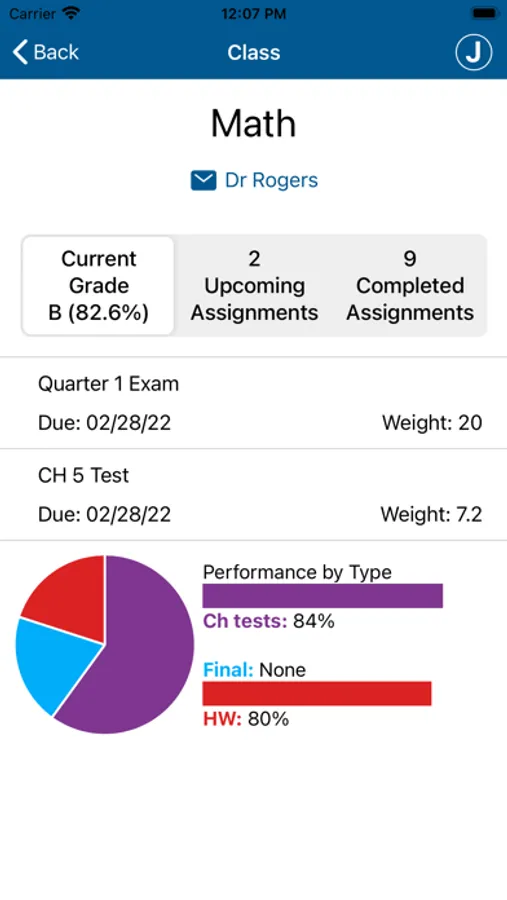 • Quick view of upcoming assignments, plus graphs of performance by assignment type category.
