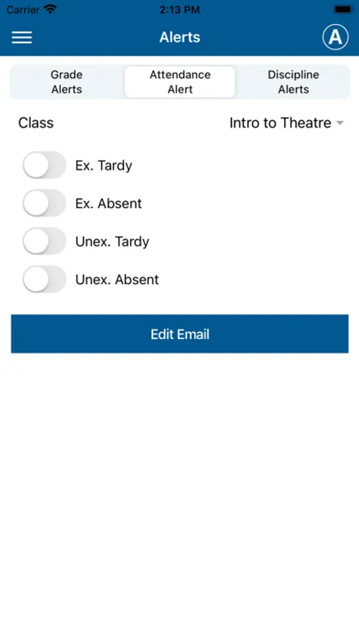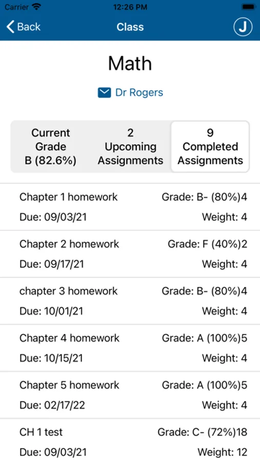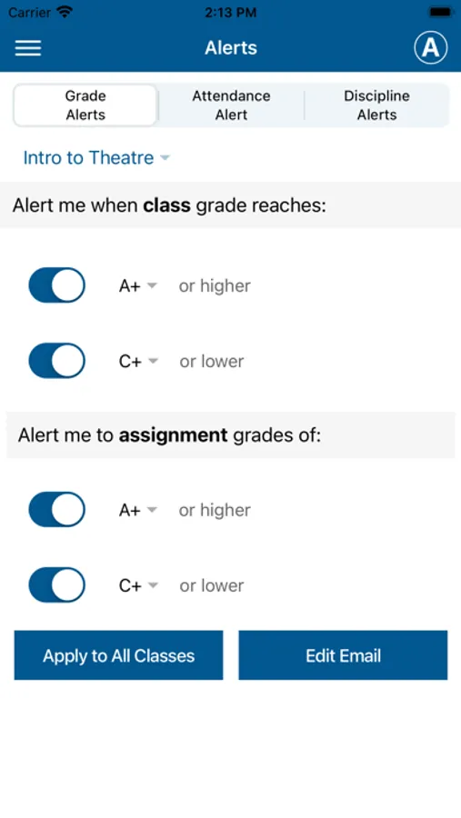 • Set and update grade alerts for all of your classes, including overall grade as well as individual assignment performance, high or low. (e.g. Tell me when my grade drops to a C)