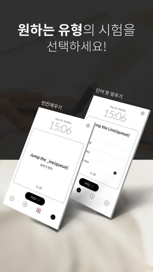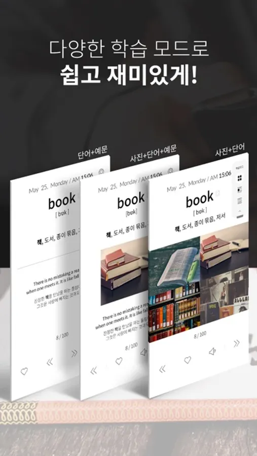 - 객관식, 철자 맞추기, 단어카드 등 원하는 학습 스타일도 선택!