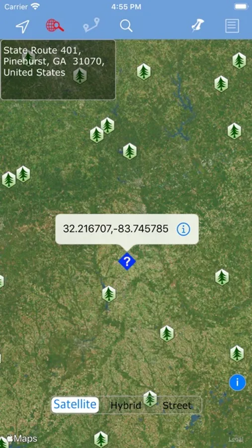 Multiple map types (Streets, Hybrid, Satellite).