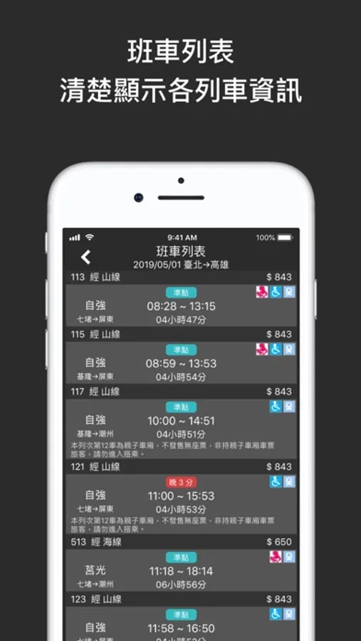・班車列表:清楚顯示各車次的資訊,幫助您快速找到想找的車次。