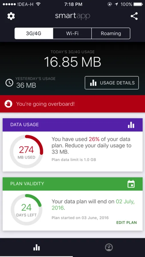 smartapp saves money by keeping you in control of your data usage.It helps you keep a daily track of your 3G/4G & Wifi usage and keeps you alerted with its unique forecasting feature.