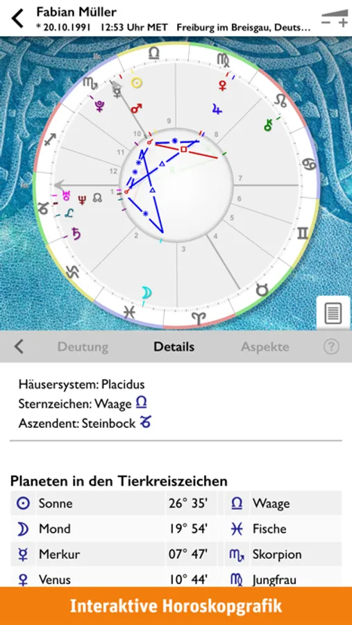 • Horoskope mit Radix-Grafik, übersichtlicher Detailinformation und Aspektarium