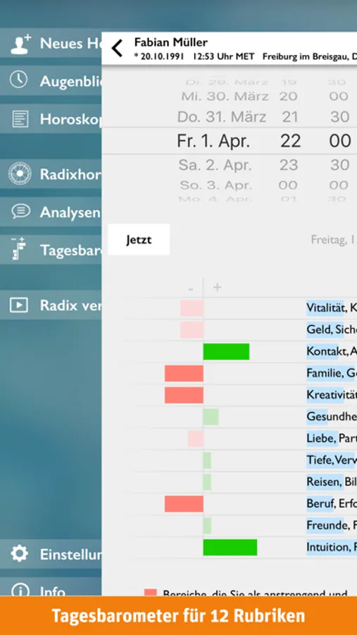 • Tagesbarometer mit Kurzanalyse zu zwölf Themen wie Gesundheit, Familie, Liebe, Beruf, Geld, Kreativität oder Freundschaft