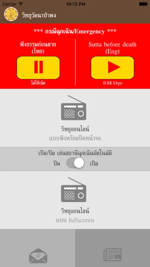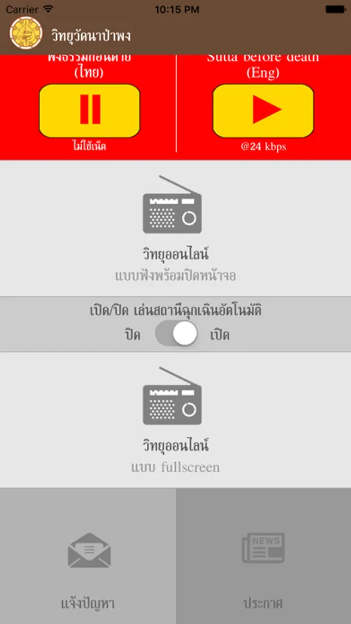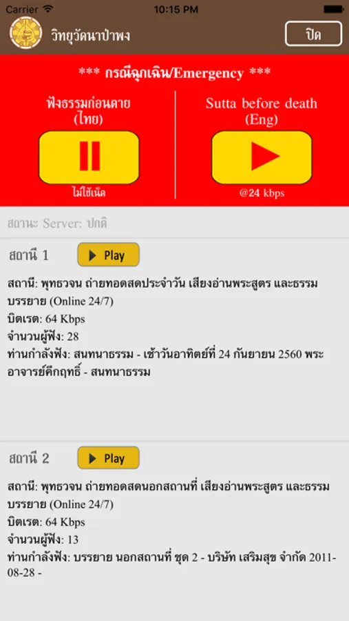 This is the application for listening to the Watnapahpong online radios. In this application, you can report the online radio problem, read the news about the online radio and help the person who is nearly dead to be listened to the Buddha sutras before death.