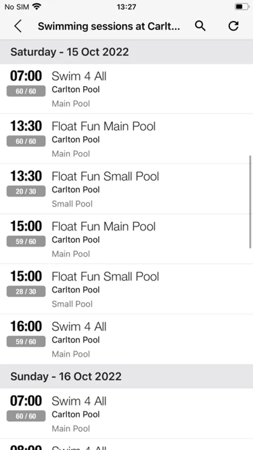 Get real-time access to your centre’s timetable for swimming sessions, including times, a description and the number of spaces available.