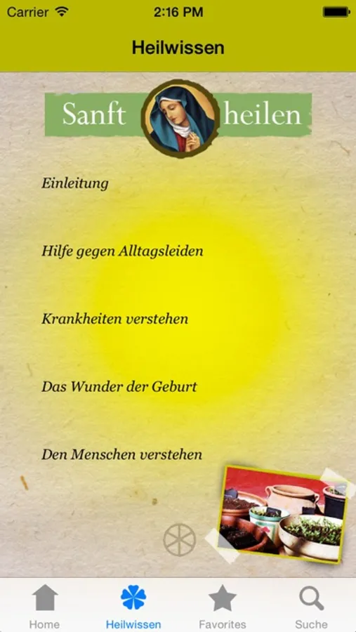 In dieser App ist das Heilwissen der Hildegard von Bingen zusammengetragen. Die App ist eine ganz wunderbare und nützliche Einführung in die Grundlagen der verschiedensten traditionellen Heilverfahren: Ernährungstherapie, Heilkräutermedizin, Heilen mit Säften und vieles mehr. Sie finden darin Anregungen zur gesunden Ernährung, Behandlungsvorschläge bei diversen Alltagsleiden und Krankheiten und dazu noch viele Rezepte aus der traditionellen Natur-Apotheke aus Hildegard von Bingen.
