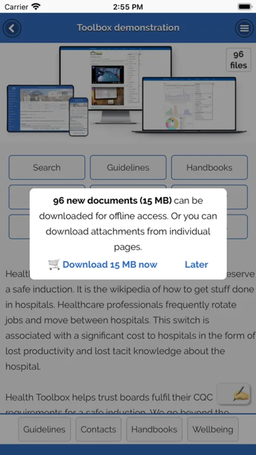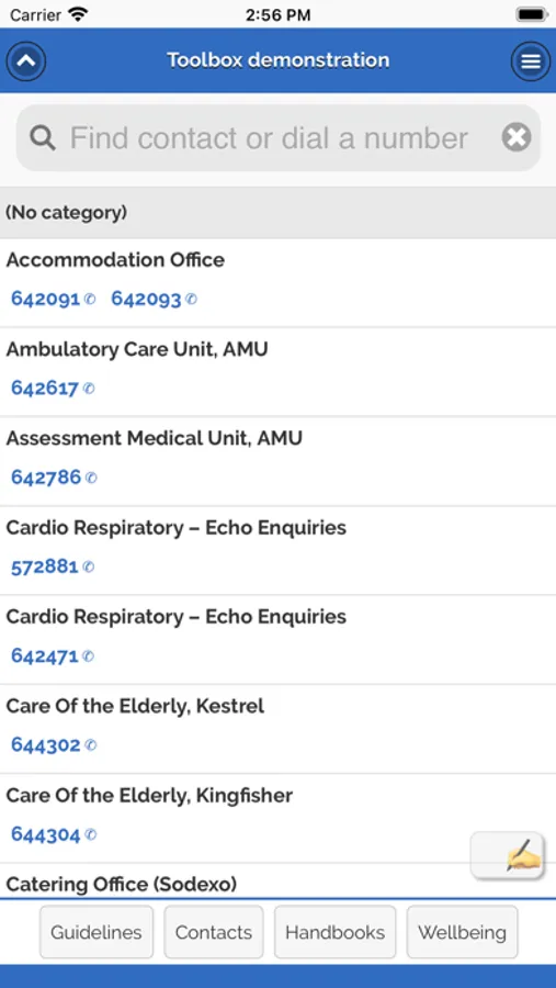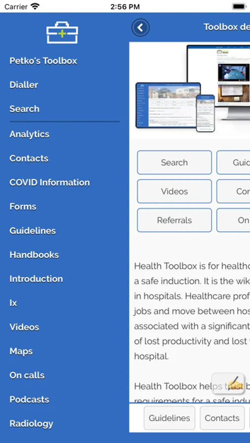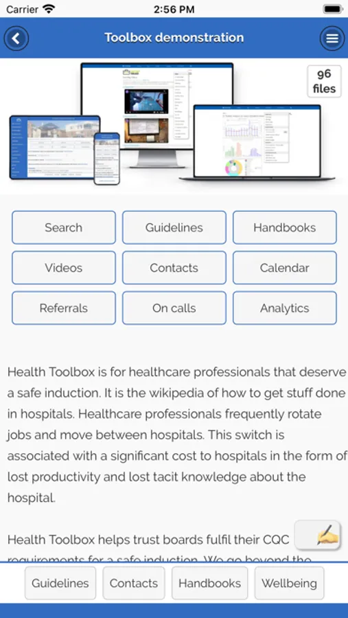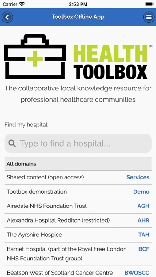 Health Toolbox (previously Dr Toolbox) is a secure online information resource set up by trainee doctors and other healthcare staff to help to better orientate themselves with their hospital and department. It includes bleep numbers, referral methods & guides. This app saves the information retrieved from the website for offline usage, including offline search.