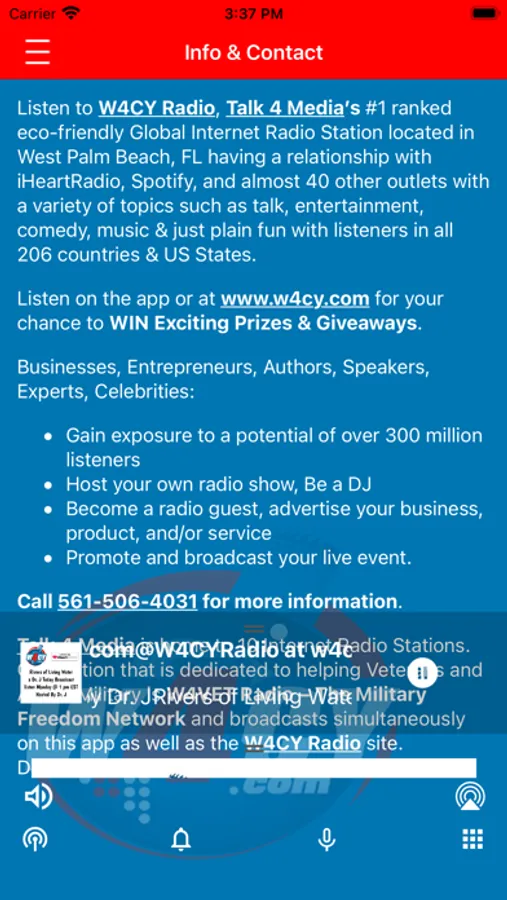 Talk 4 Media is home to 10 Internet Radio Stations partnered with iHeartRadio. Our station that is dedicated to helping Veterans and Active Military is W4VET Radio – The Military Freedom Network and broadcasts simultaneously on this app. Download and listen to our other station apps for other topics, shows, and hosts: