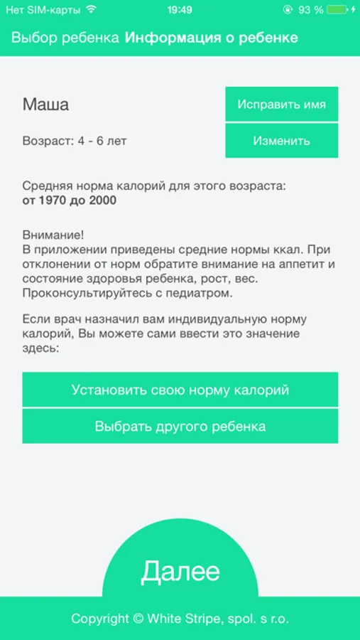 - по умолчанию в приложении указаны стандартные (средние) нормы калорийности рациона ребенка от 7 месяцев до подросткового возраста.
