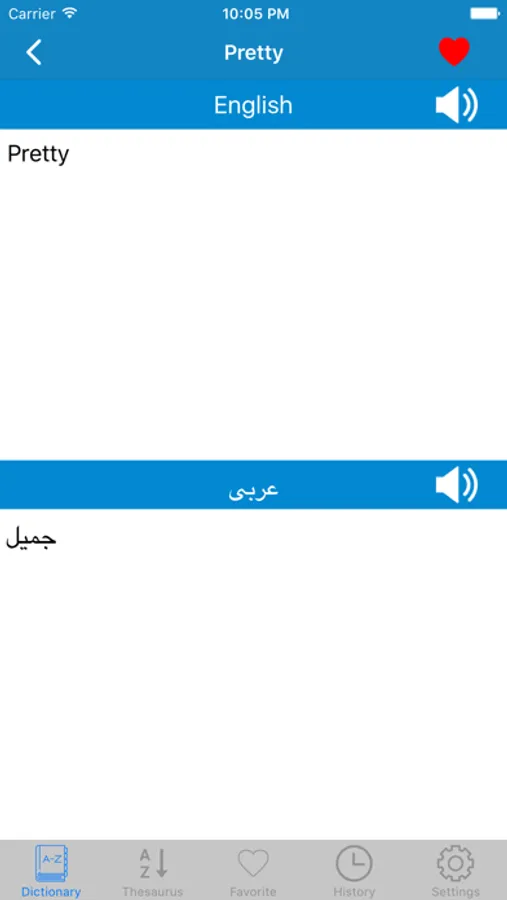 ▩ The first feature is English to Arabic dictionary, where you can enter the English word and for that you will get the Arabic meaning of the word, along with the Arabic pronunciation.